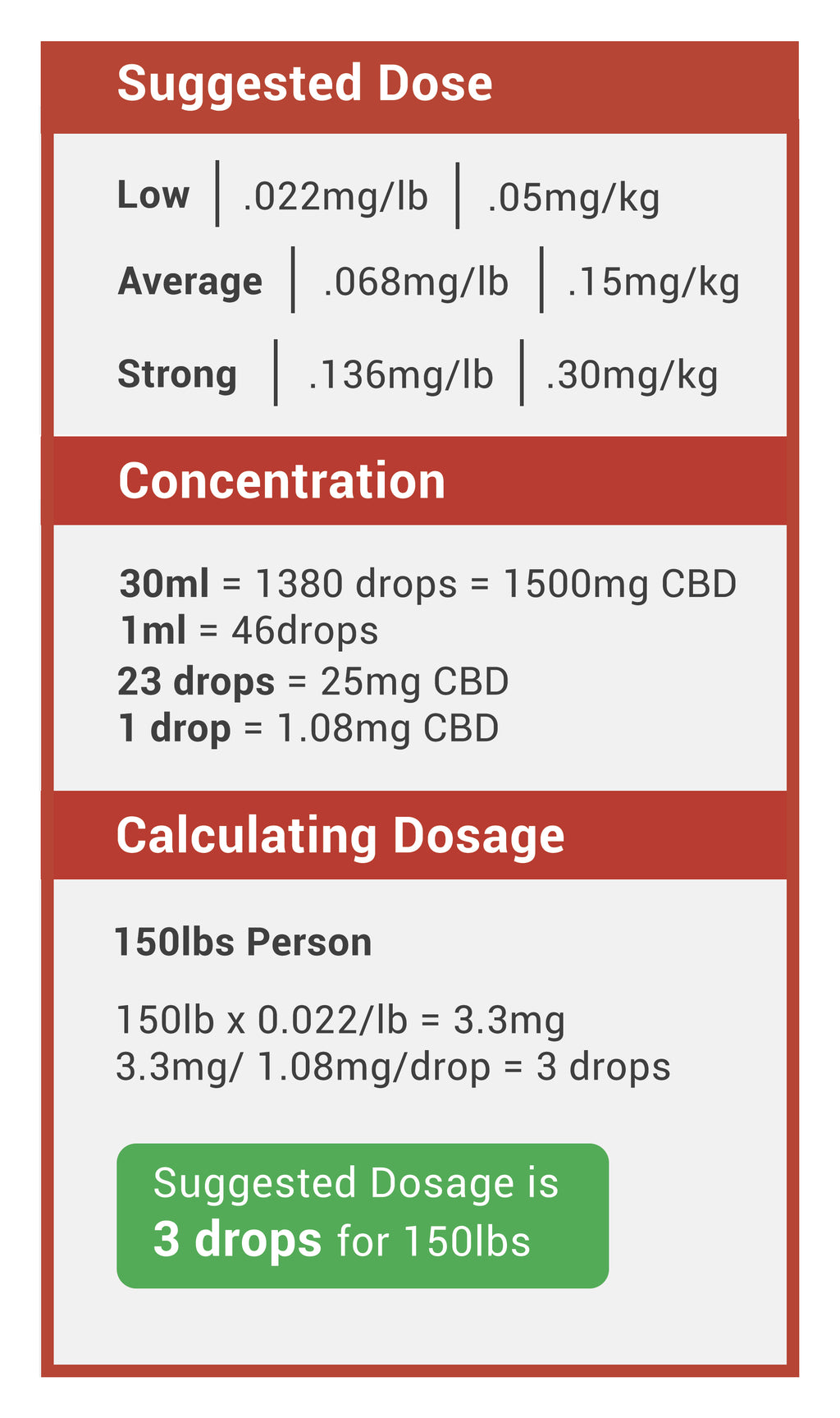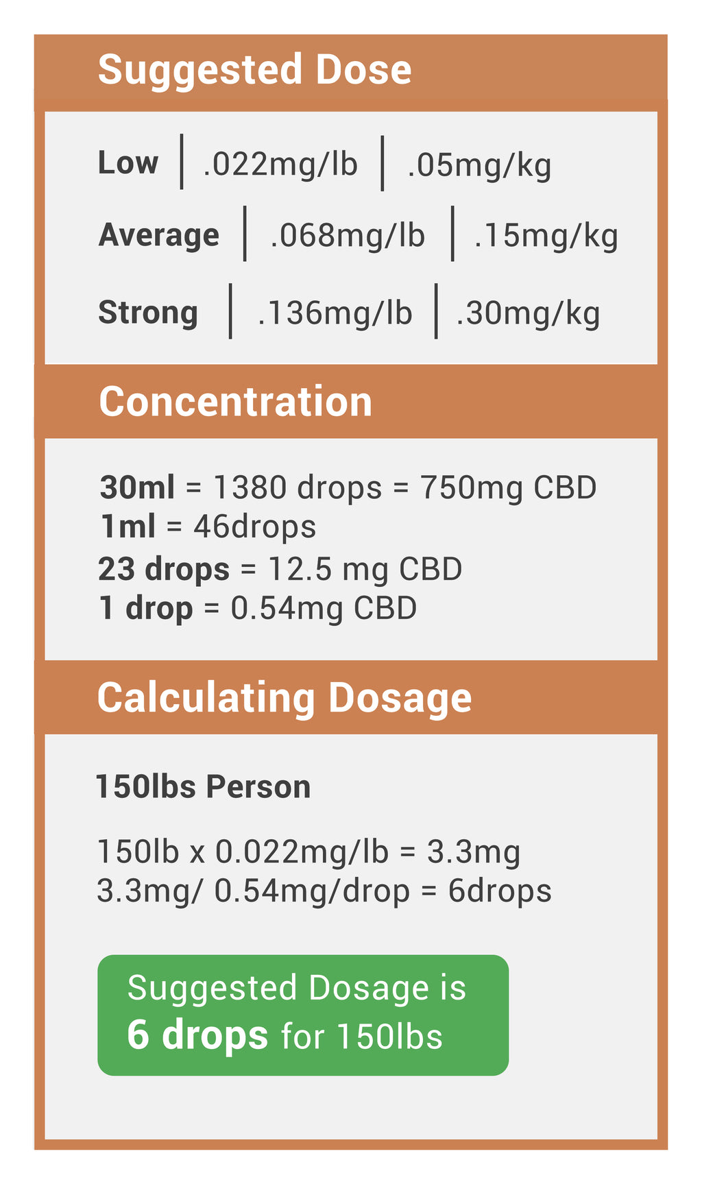One of the most common complaints we hear about CBD is not that doesn’t work, but that figuring out the right dose can be a real pain. So we created a CBD dosage calculator that figures it all out for you and makes dosing incredibly easy. Make sure that when you are entering in your information that you only enter numbers. If you enter letters (oz, mg, lbs), then you will not get a reading and it will say Naan.